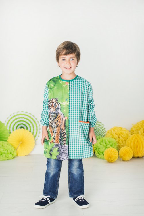 Tabliers scolaires d'école personnalisées avec Tigre de PRONENS. Protégez les vêtements que vous avez achetés pour vos enfants avec tant d'amour et évitez qu'ils ne tachent à la maison ou à l'école. Nos tabliers d'école sont confectionnées avec le tissu de la meilleure qualité du marché, doux et très résistant, elles comportent une fermeture avec des boutons colorés sur le devant. Personnalisez cette tablier d'école amusante avec le nom de vos enfants brodé et créez une robe d'école personnalisée amusante!